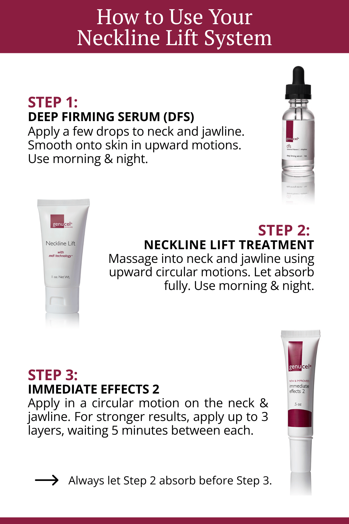 Step 1: Apply a few drops of the deep firming serum to neck and jawline.  Smooth onto skin in upwards motion. Use morning & night.